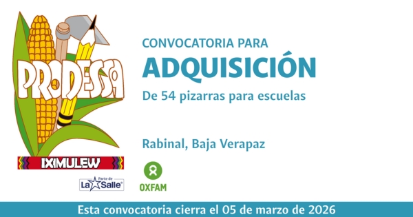 El Proyecto de Desarrollo Santiago -PRODESSA-, en el marco del proyecto: Escolarización para un futuro mejor de la niñez y juventud indígena en Guatemala, con el apoyo financiero de Oxfam, convoca a persona individual o empresa para la fabricación o suministro, embalaje, transporte y envío de 54 pizarras que cumplan...
