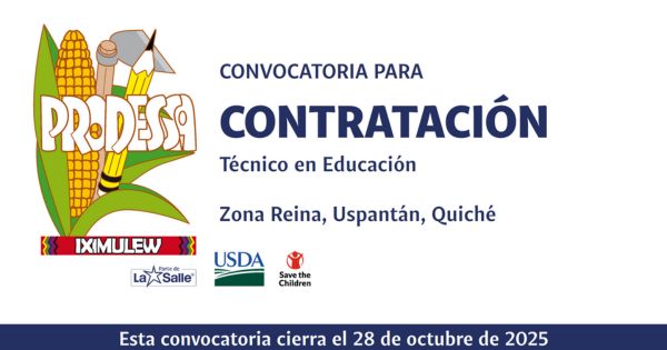 El Proyecto de Desarrollo Santiago -PRODESSA-, en el marco del proyecto: Sistema de Alimentación, Bienestar y Educación Sostenible (SABES), con el apoyo financiero de USDA y Save the Children, convoca a Profesor en Educación Bilingüe Intercultural con estudios en Pedagogía o carreras afines para organizar y ser partícipe a nivel...