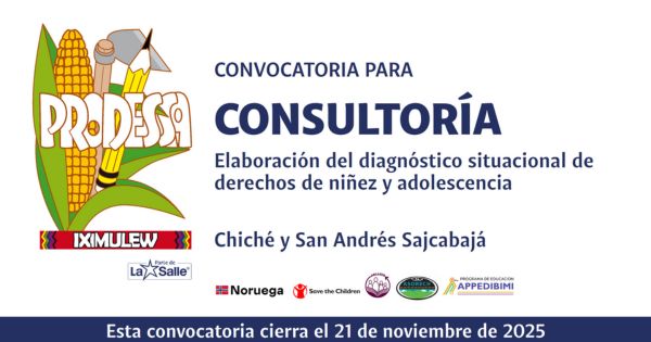 El Proyecto de Desarrollo Santiago -PRODESSA-, en el marco del Proyecto de Desarrollo Socioemocional Tz'aqatil , con el apoyo financiero de Educo, contratará a una consultora, consultor o equipo consultor para diseñar la propuesta pedagógica de seis herramientas y/o estrategias dirigidas a padres y madres de familia de 14 escuelas...