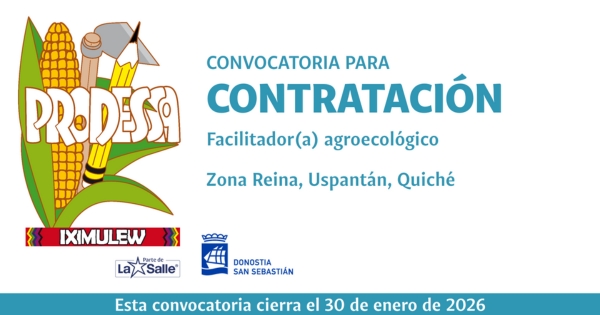 El Proyecto de Desarrollo Santiago -PRODESSA-, en el marco del proyecto: Empoderamiento de mujeres indígenas a través de emprendimientos agroecológicos solidarios en Zona Reina, Quiché, Guatemala, Fase 2, con el apoyo financiero de Donostia San Sebastián, convoca a estudiante universitario de ciencias ambientales, agrícolas, forestales o carrera a fin.Puede acceder...