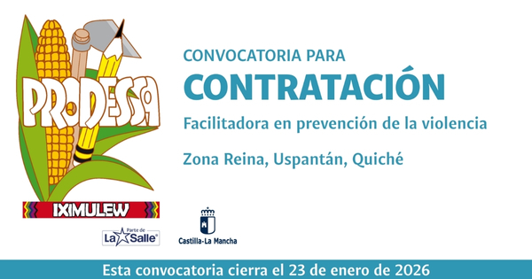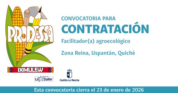 El Proyecto de Desarrollo Santiago -PRODESSA-, en el marco del proyecto: Fortalecer la autonomía económica y empoderamiento político de mujeres maya q’eqchi’s con enfoques de agroecología y prevención de la violencia de género en la Zona Reina, Uspantán, Guatemala, con el apoyo financiero de Castilla-La Mancha, convoca a estudiante universitario...