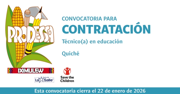 El Proyecto de Desarrollo Santiago -PRODESSA-, en el marco del Proyecto de Educación Socioemocional Tz'aqatil, con el apoyo financiero de Educo, convoca a personas con estudios universitarios en psicología, psicopedagogía, profesorado en educación o carreras afines, para brindar acompañamiento técnico y metodológico a docentes, directores, padres y madres de familia,...