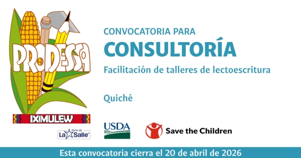 El Proyecto de Desarrollo Santiago -PRODESSA-, en el marco del proyecto: Eslabones para el buen vivir: hacia un futuro justo y sostenible en la agroindustria de Guatemala, contratará a una consultora, consultor o equipo consultor para facilitar cuatro talleres presenciales en idioma Q’eqchi’ dirigidos a personas adultas y jóvenes de...