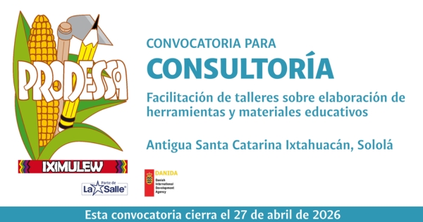 El Proyecto de Desarrollo Santiago -PRODESSA-, en el marco del Proyecto de Educación Socioemocional Tz'aqatil, con el apoyo financiero de Educo, convoca a personas con estudios universitarios en psicología, psicopedagogía, profesorado en educación o carreras afines, para brindar acompañamiento técnico y metodológico a docentes, directores, padres y madres de familia,...